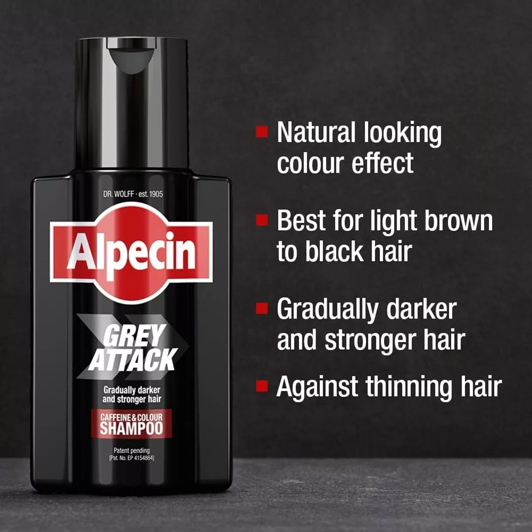NATURALLY AGAINST (FIRST) GREY HAIR: Alpecin Grey Attack gradually darkens your hair, step by step, with a particularly natural color effect. Suitable for any hair color, but best for light brown to black hair.CONTROL COLOUR INTENSITY: Adjust the intensity of the color effect through application time and frequency. Longer application times lead to a more intense effect. First results are visible after 2–4 weeks of everyday use, leaving your hair looking darker and fuller.YOUR DAILY HAIR ROUTINE: Simply lather into the scalp, leave for 2–5 minutes, and rinse off. Use daily for the first few weeks until the desired result is achieved. Then alternate with normal shampoo to maintain the shade.HELPS TO FIGHT THINNING HAIR: With its unique galenic formula and optimal caffeine dosage (plus other potent active ingredients), Alpecin Grey Attack Shampoo supports natural hair growth.MOST SUCCESSFUL SHAMPOO IN GERMANY: Alpecin Caffeine Shampoo is the best-selling shampoo to fight thinning hair in men in Germany (Nielsen). German engineering for your hair!