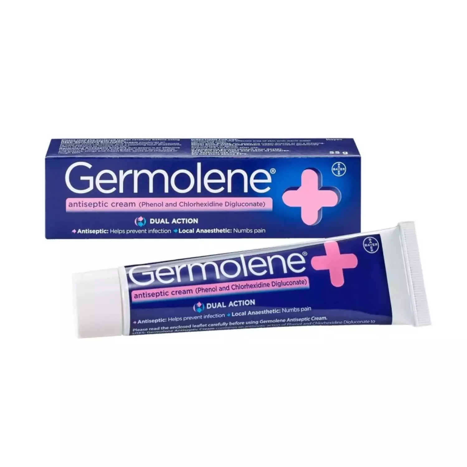 Germolene Antiseptic Cream is a non-greasy cream that rubs into the skin easily. Its antiseptic action helps to prevent infection while a soothing local anaesthetic numbs pain and helps to relieve itching and irritation from minor skin injuries. Germolene combines the antiseptic action of Chlorhexidine Digluconate with the antiseptic and local anaesthetic action of Phenol into a handy dual action formula. It is ideal for treating minor cuts and grazes, minor burns, scalds and blisters, stings and insect bites, spots, and chapped or rough skin.